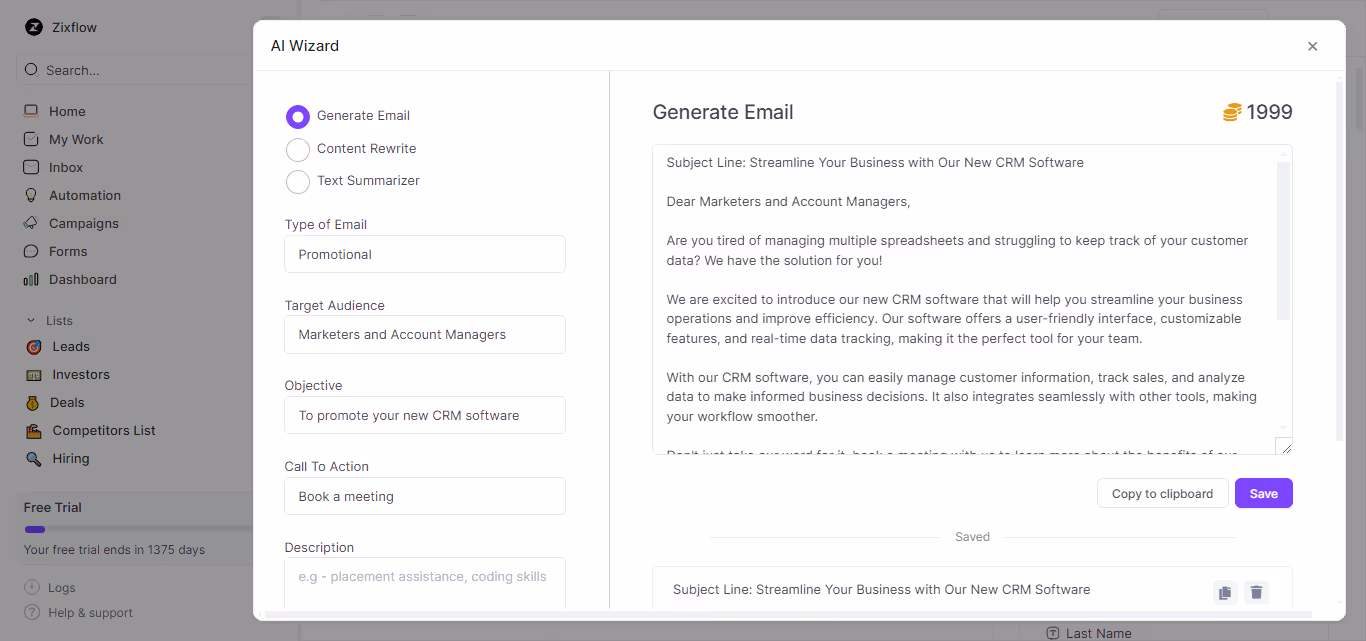 Furthermore, being an AI-driven solution, Zixflow lets you craft highly personalized and relevant emails with its AI Wizard. This way, you will not have to spend time thinking about the perfect subject line or email body as the system can do that for you within seconds, allowing you to incorporate various types of content in your sales engagement.