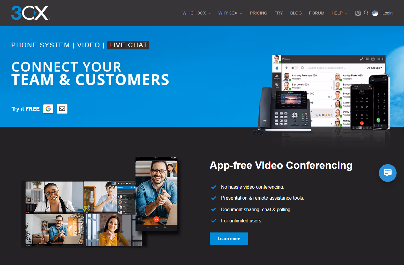3CX is communication software designed for companies of various shapes and sizes. 3CX has a native phone system with features such as video calls and call queues. On top of that, you can connect your online live chat and Facebook messages with the platform to manage them effectively from one location.