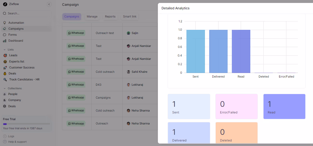 Zixflow is best at WhatsApp marketing automation. Its automated campaigns allow you to automate your outreach across various channels, including email, SMS, and WhatsApp. You can set up personalized email sequences, and automated follow-ups, and trigger-based messages based on customer behavior. By using AI-Wizard for content creation and smart delivery, you can maximize engagement and lead nurturing.