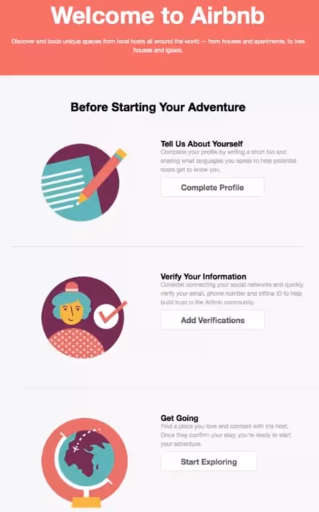 Airbnb, a renowned travel and accommodation company, sends a checklist of tasks to their first-time subscribers, asking them to take action right from the start. The light-colored background ensures that the readers focus on the content and makes them focus on the CTAs.