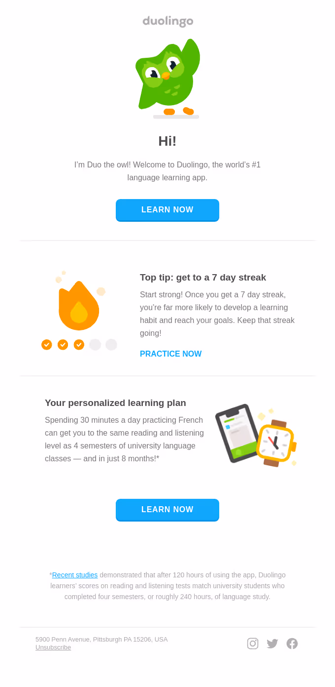 The email also highlights the brand’s statistics, stating that just 30 minutes of daily practice can equate to four semesters of university language courses, supported by a reference to recent studies. This way, Duolingo not only emphasizes its value but also sets realistic goals for its users.