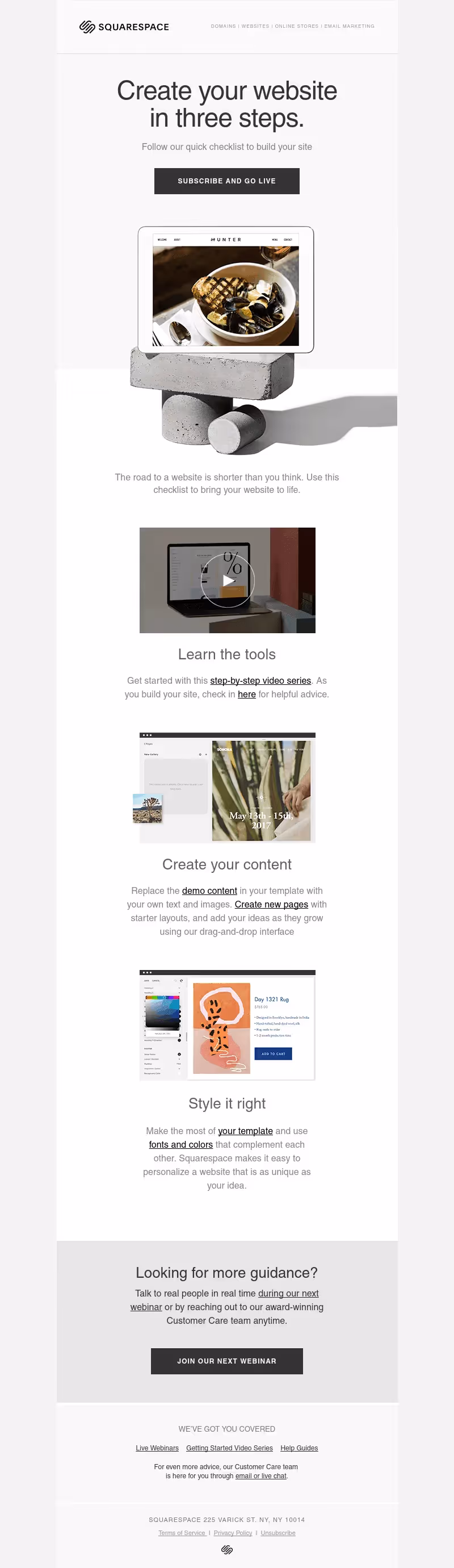 The welcome email from Squarespace is a great example of clarity and user-friendliness, guiding new subscribers through the process of creating a website in just three steps.
