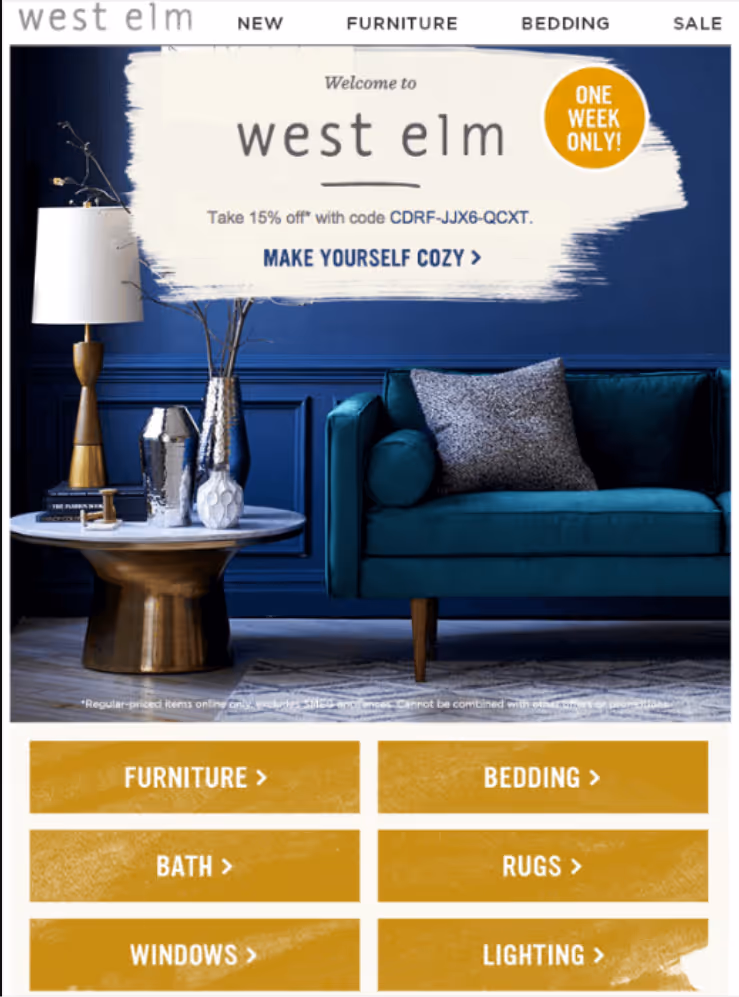 West Elm employs a sales psychology tactic and opens its welcome email by jumping straight into the action. Providing a discount code to take 15% off the next purchase, is urging the subscribers to take action instantly and creating a sense of urgency.