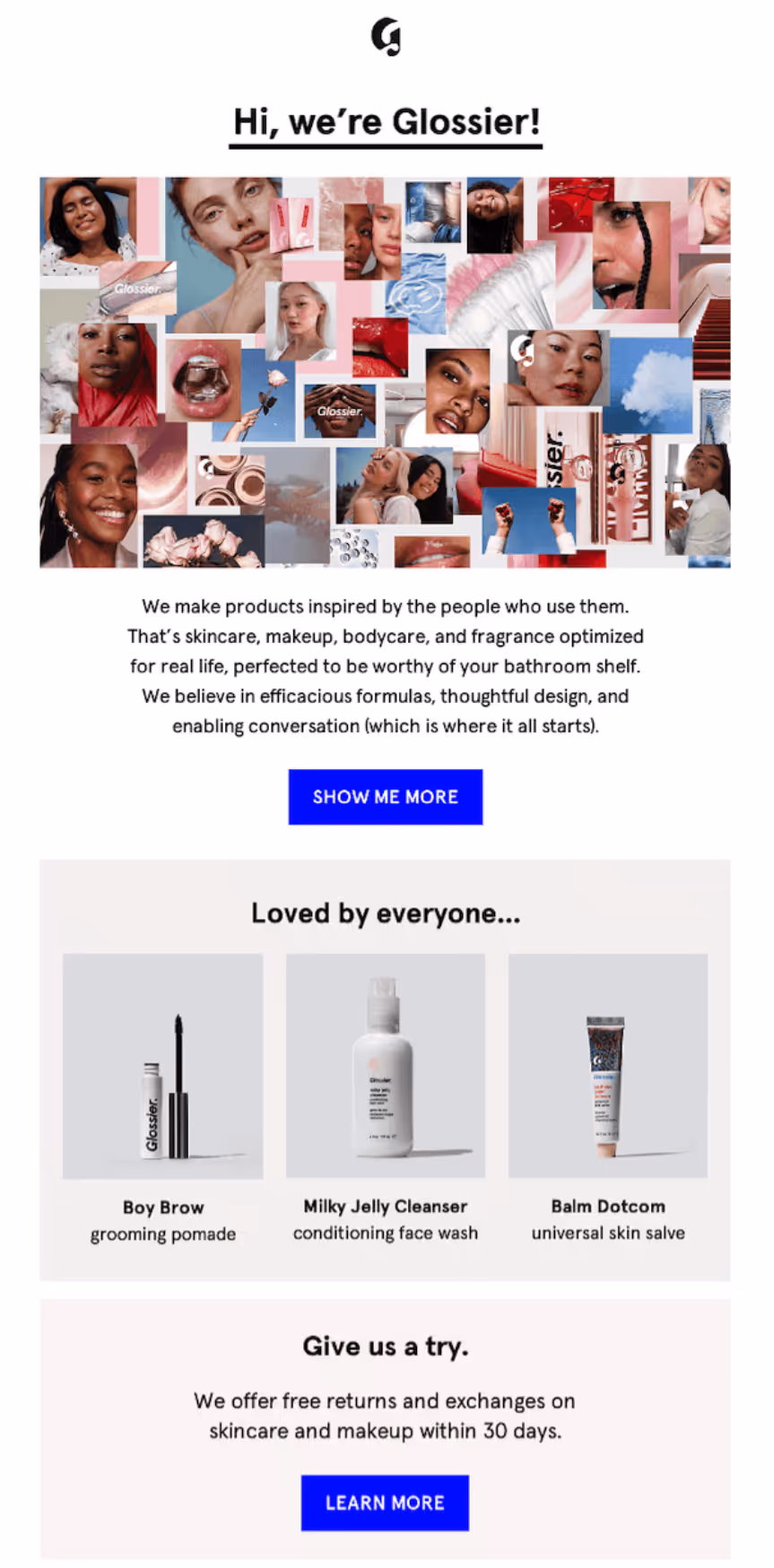 The email starts with a friendly greeting and a collage of high-quality images of customers using Glossier’s products. After that collage, there is a brief introduction about the brand, explaining its philosophy and what sets it apart, helping it build a relationship with new subscribers.