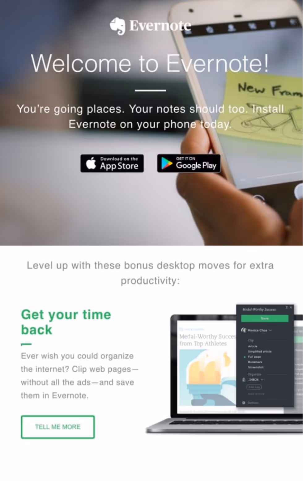 Evernote does a great job of engaging subscribers by telling them directly to download its mobile app to access their notes on the go. However, in case you don’t want to use Evernote on the phone, the email then goes into “bonus desktop moves” to boost your productivity on the PC.