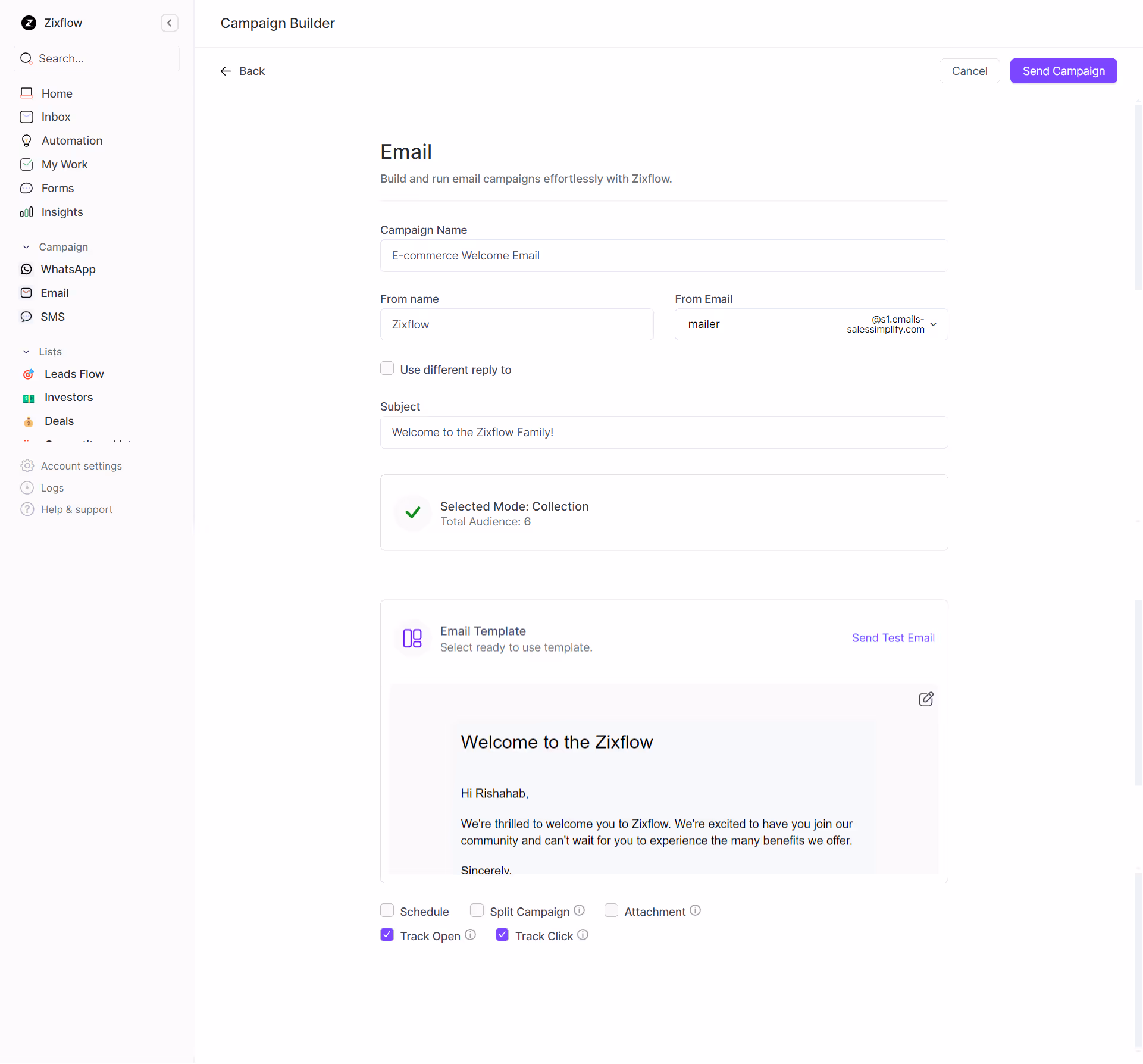 Now, you are ready to send your welcome emails. Set up a campaign by entering a name, selecting a domain, filling in the subject line, adding an audience, and choosing a template. Once you have filled in all the necessary information, click Send Campaign, and that’s it.
