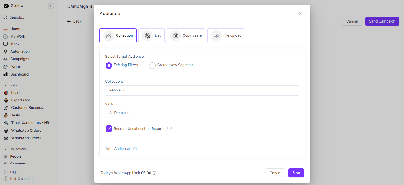 But if you upgrade to WhatsApp Business API providers like Zixflow, you get a much higher limit. Zixflow allows you to send messages to bulk messages at once. This is great for you if you have lots of customers.