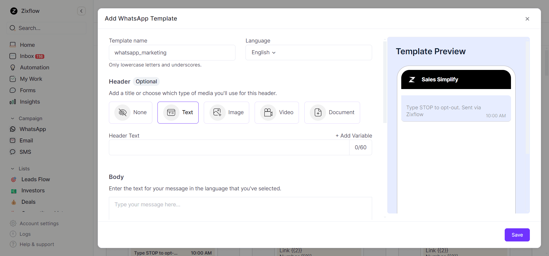 In addition to that, since Zixflow is a complete marketing solution, you can design WhatsApp Business Messaging templates directly from the platform and send them to Meta for approval before you can use them in your campaigns.