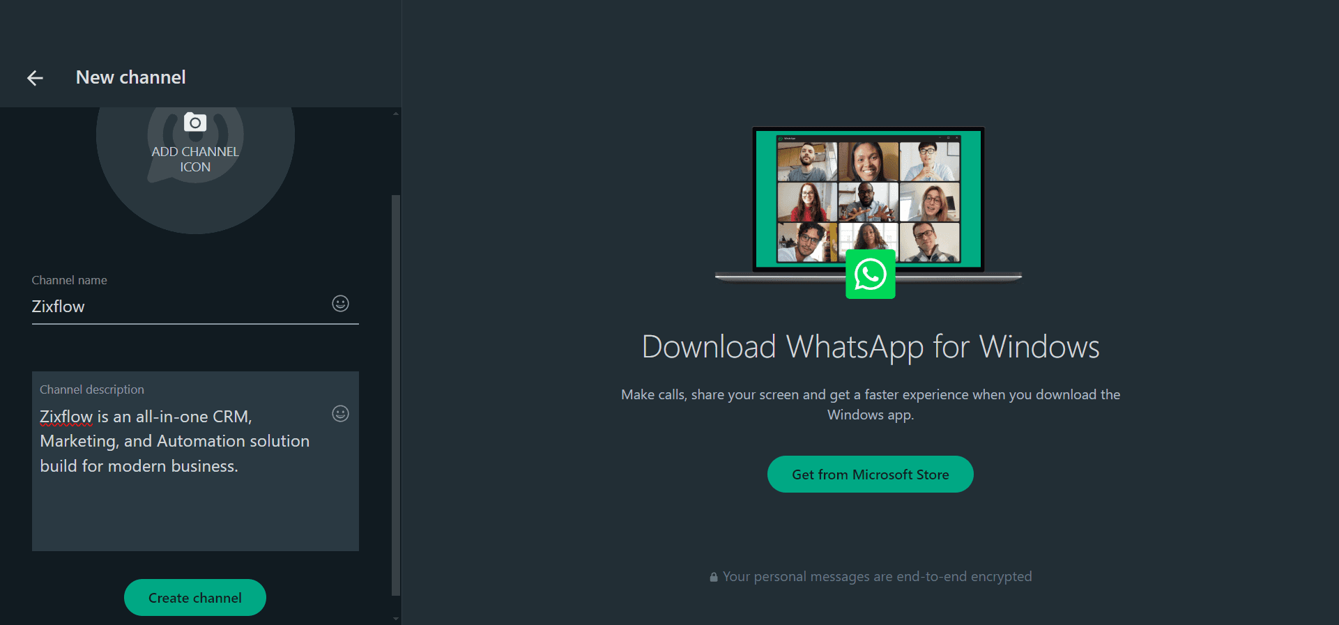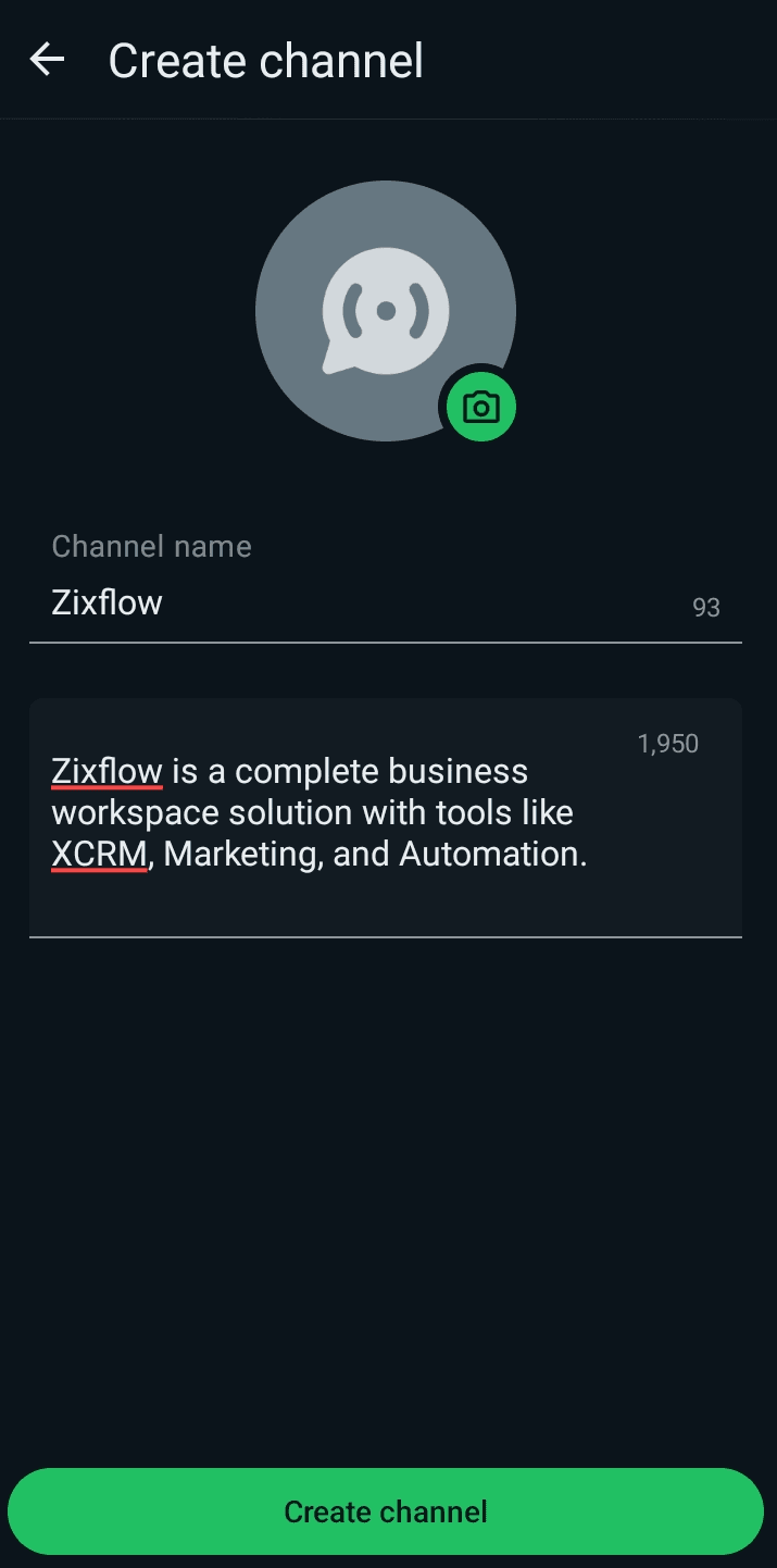 Click on Continue and proceed to the next screen. Once here, enter a name, description, and an icon image for your WhatsApp Channel. Press the Create channel button to finally finish the setup process.