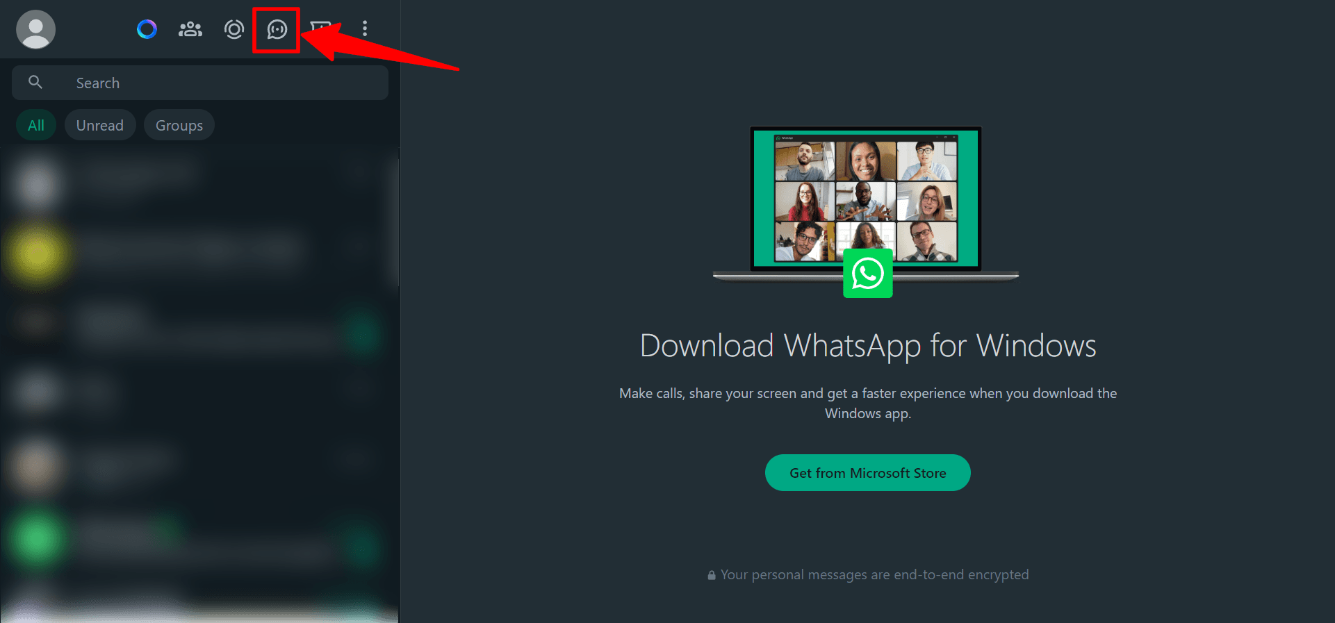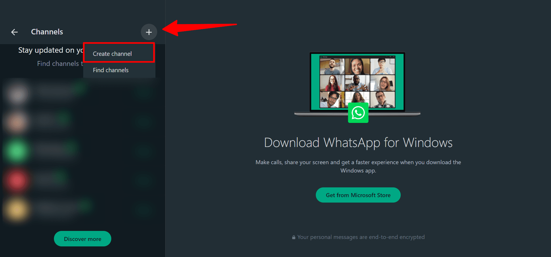 Log in to your WhatsApp account a browser and go to the Channels section by pressing on the Channels icon.