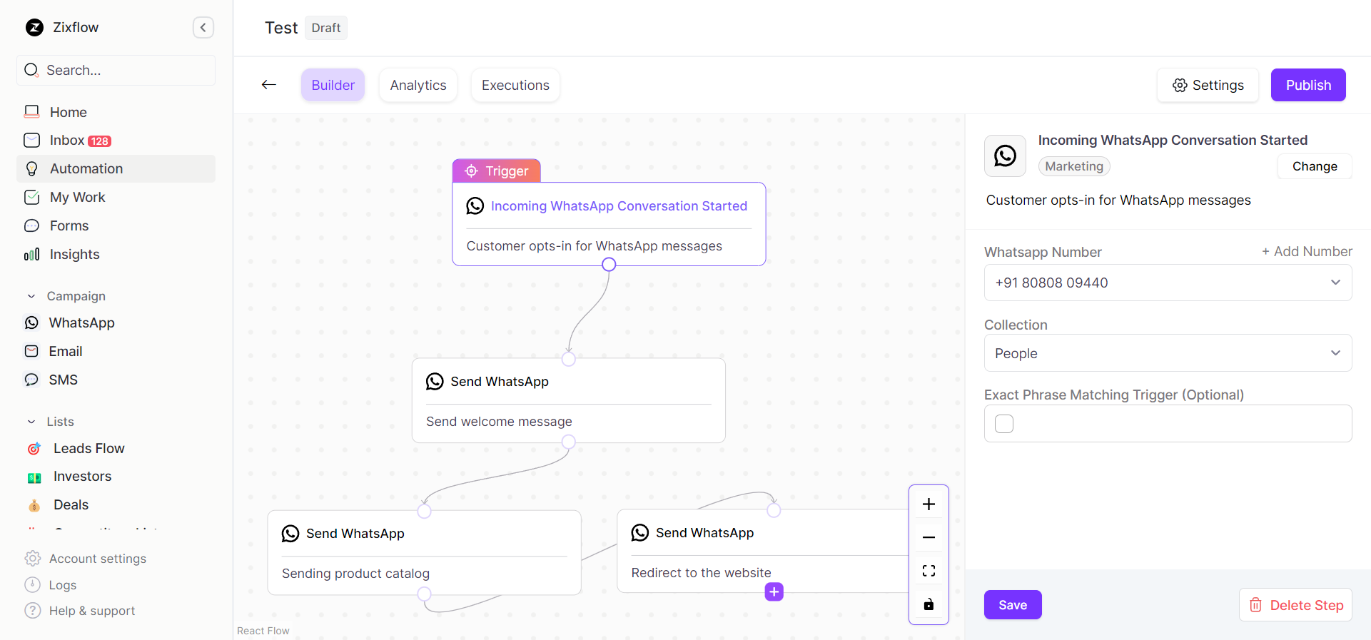 So, to create a WhatsApp chatbot, you will have to get an AI-driven automation platform, and once again, Zixflow is one such solution. By using Zixflow’s Automation Flows, you can design a WhatsApp bot that can help you automate your customer support conversations.