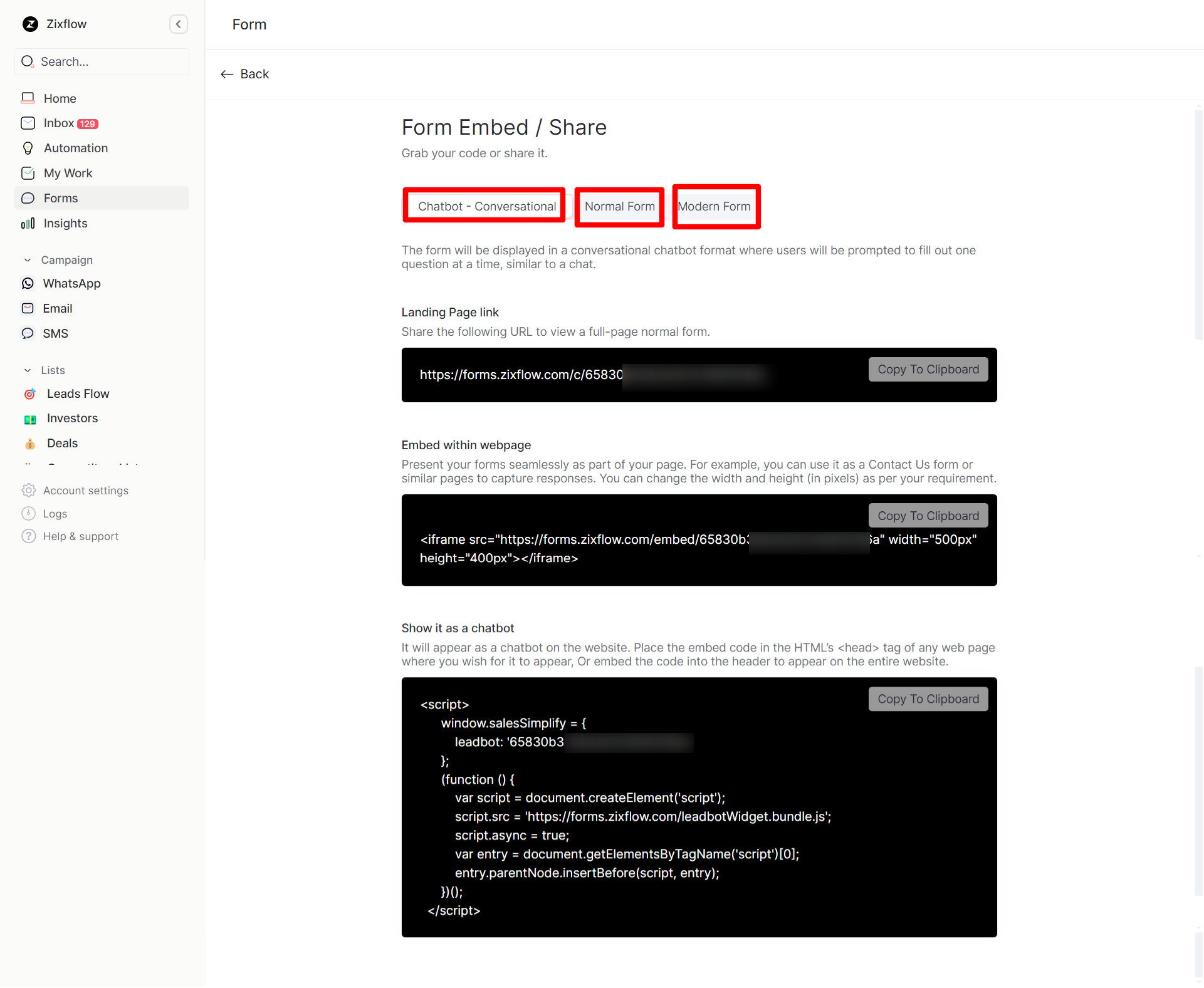 That is not all. Zixflow offers you a variety of ways to share or embed these forms. They are as follows: