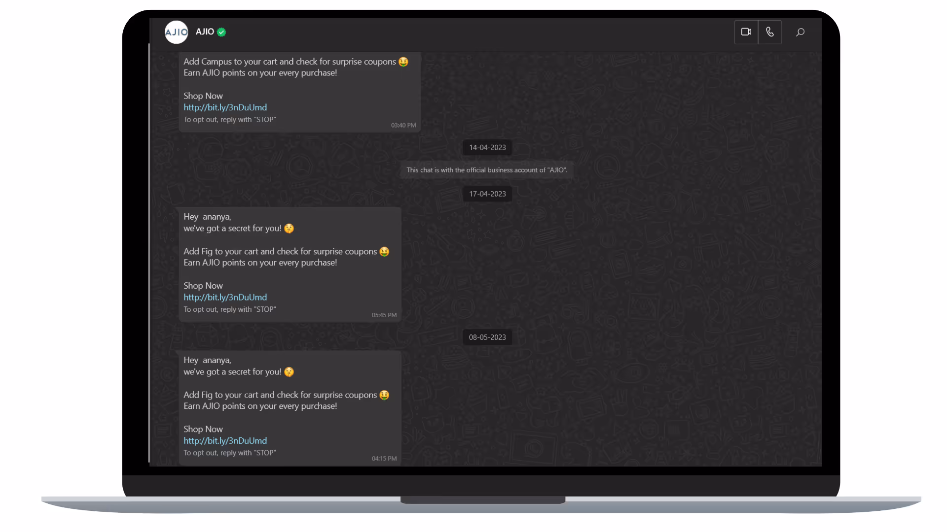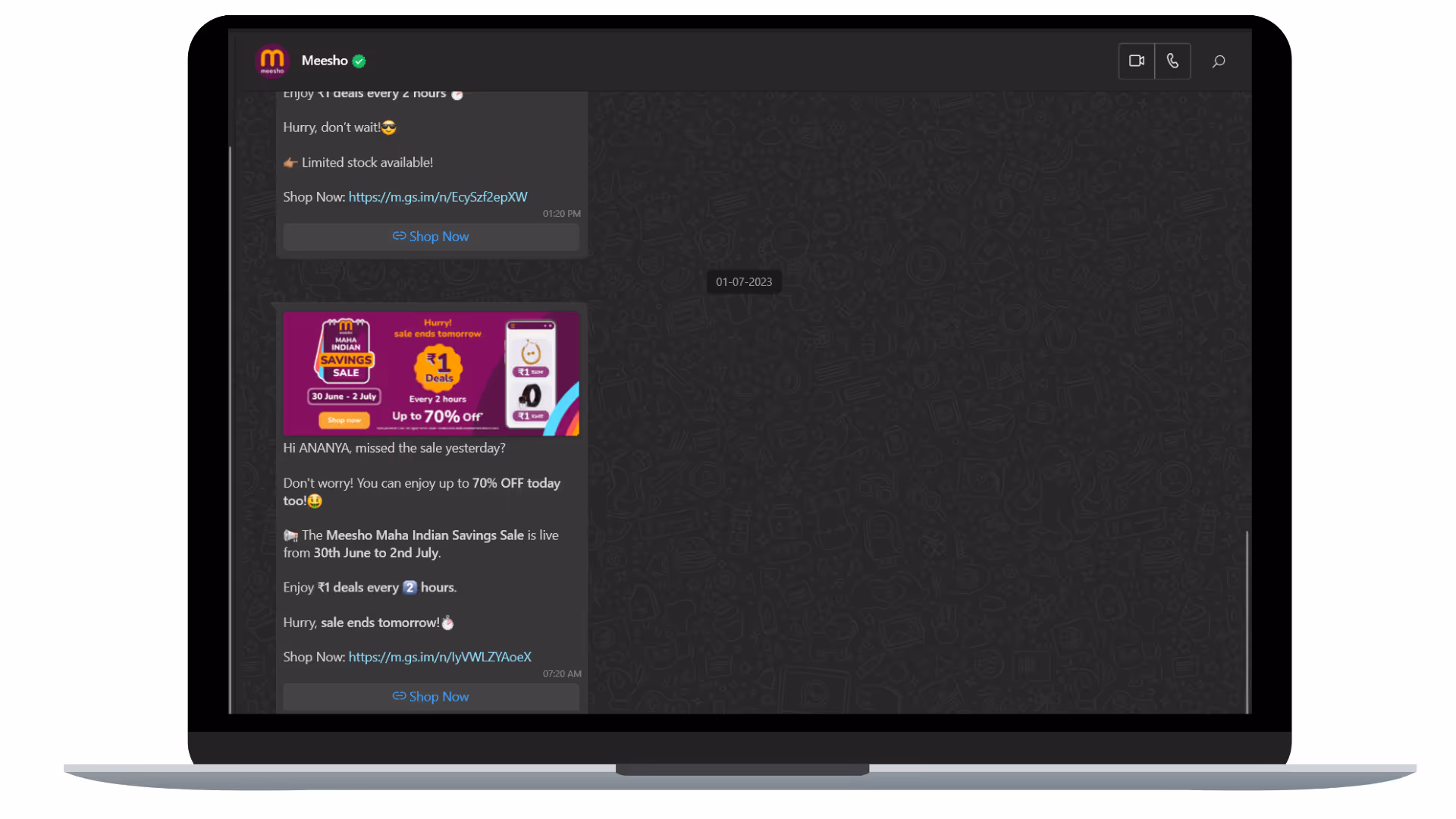 By providing limited-time discounts and promotions over WhatsApp, you may evoke a sense of exclusivity and urgency. To let clients know about time-limited offers, flash sales, or early access to new product launches, use personalized messaging.