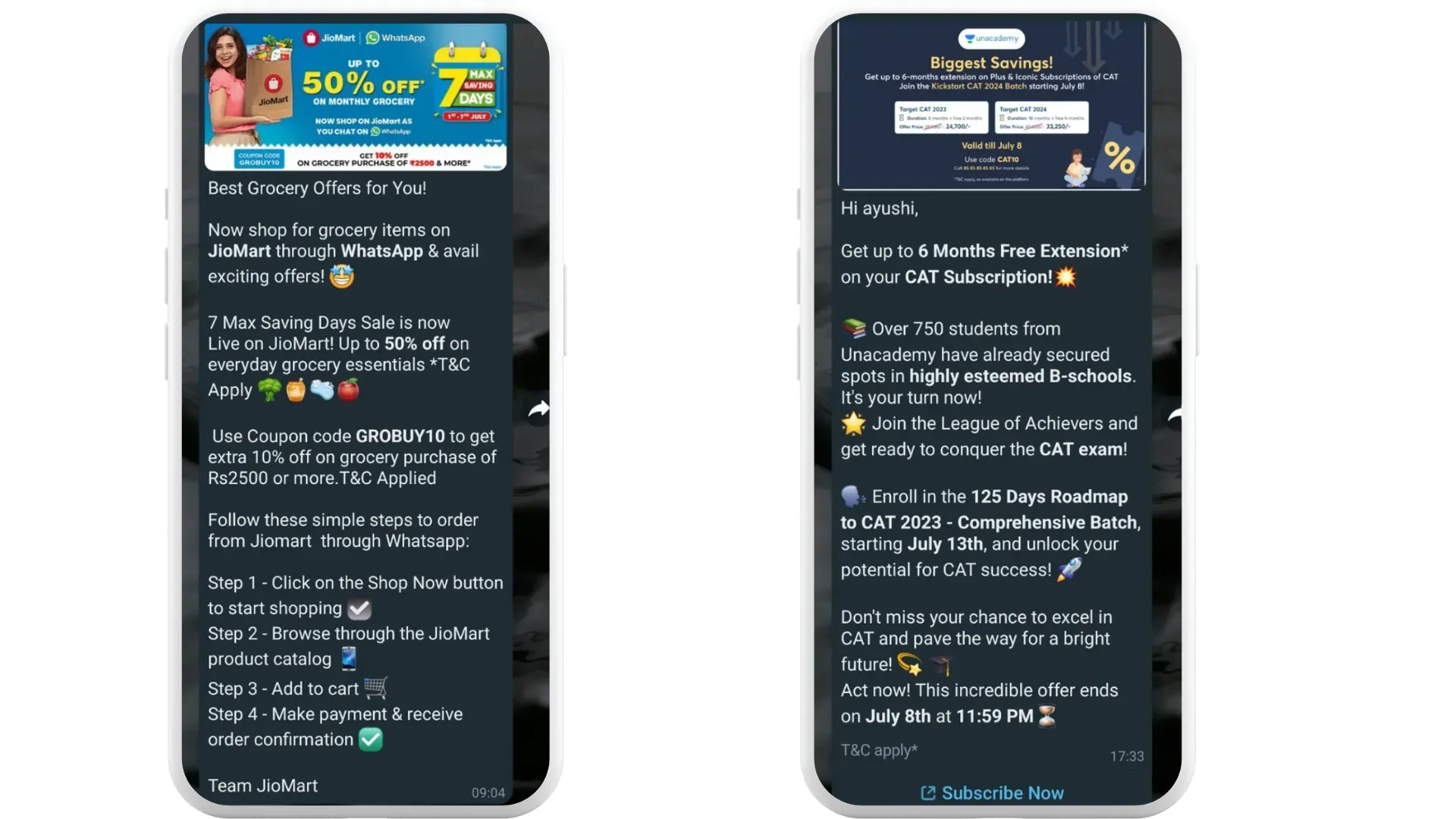 Create a sense of urgency by offering time-limited discounts exclusively through WhatsApp. This motivates recipients to take immediate action, increasing the chances of a conversion. For example, a restaurant can send a WhatsApp message offering a ‘Flash Sale’ discount on a specific day or time, encouraging customers to make a reservation or place an order within a limited window.