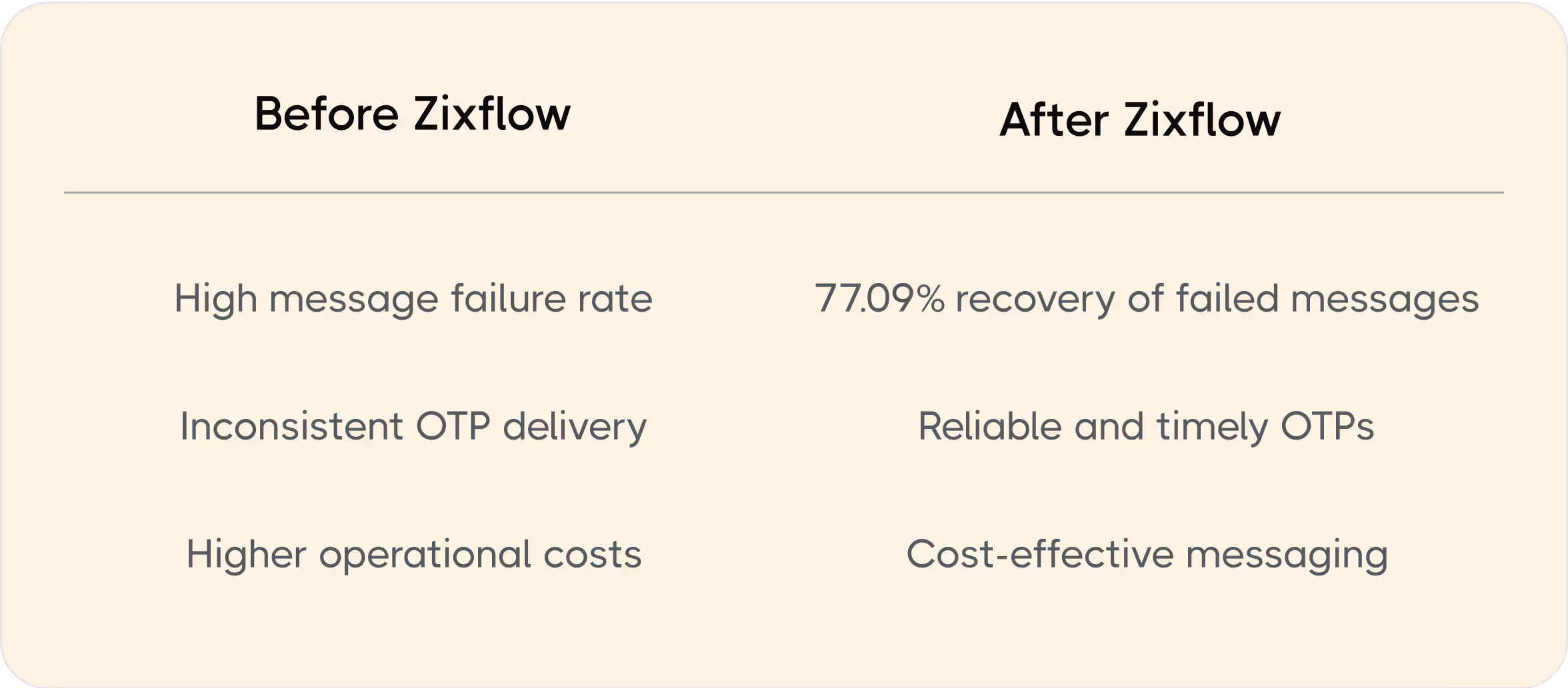 "Zixflow has been a game-changer for us! With its Smart API automated fallback, we recovered 77.09% of failed messages effortlessly. Autopilot optimized everything while keeping costs low. More OTPs delivered means more revenue—it's that simple!"