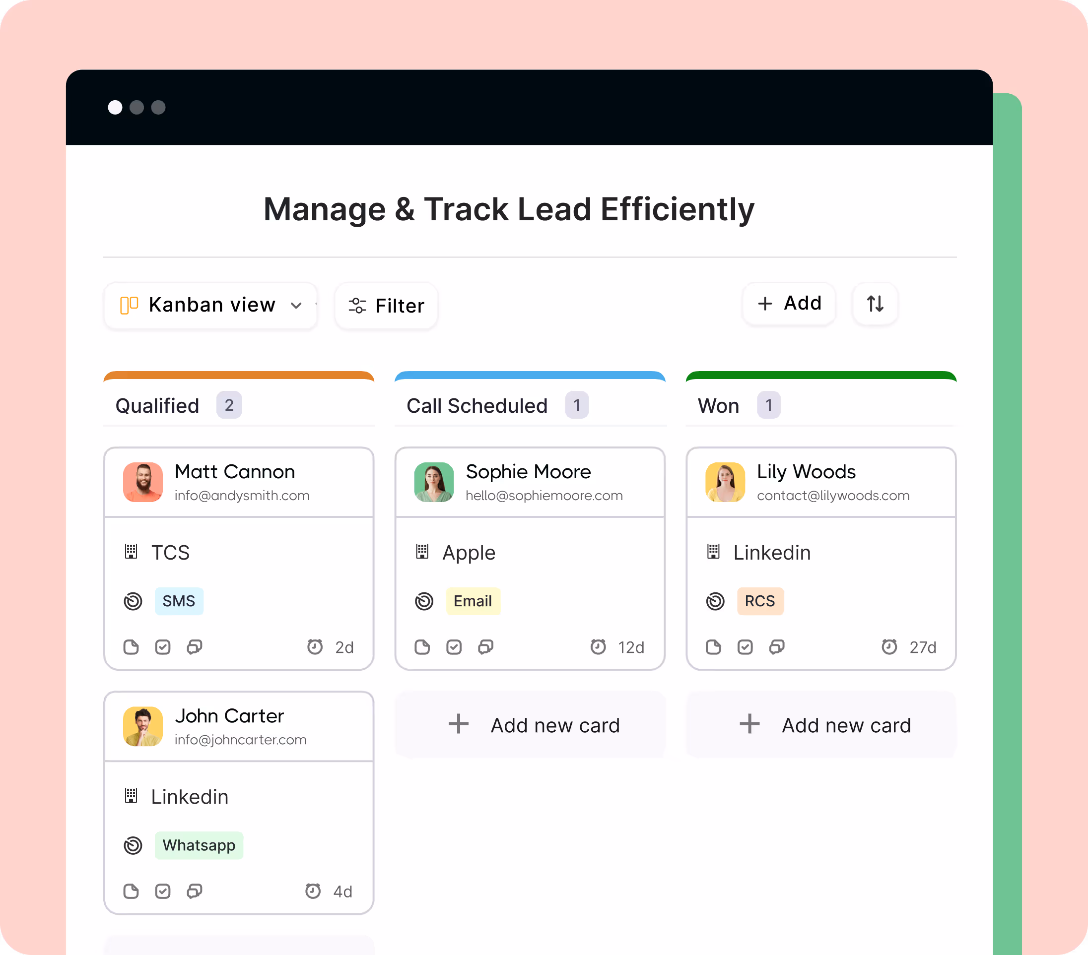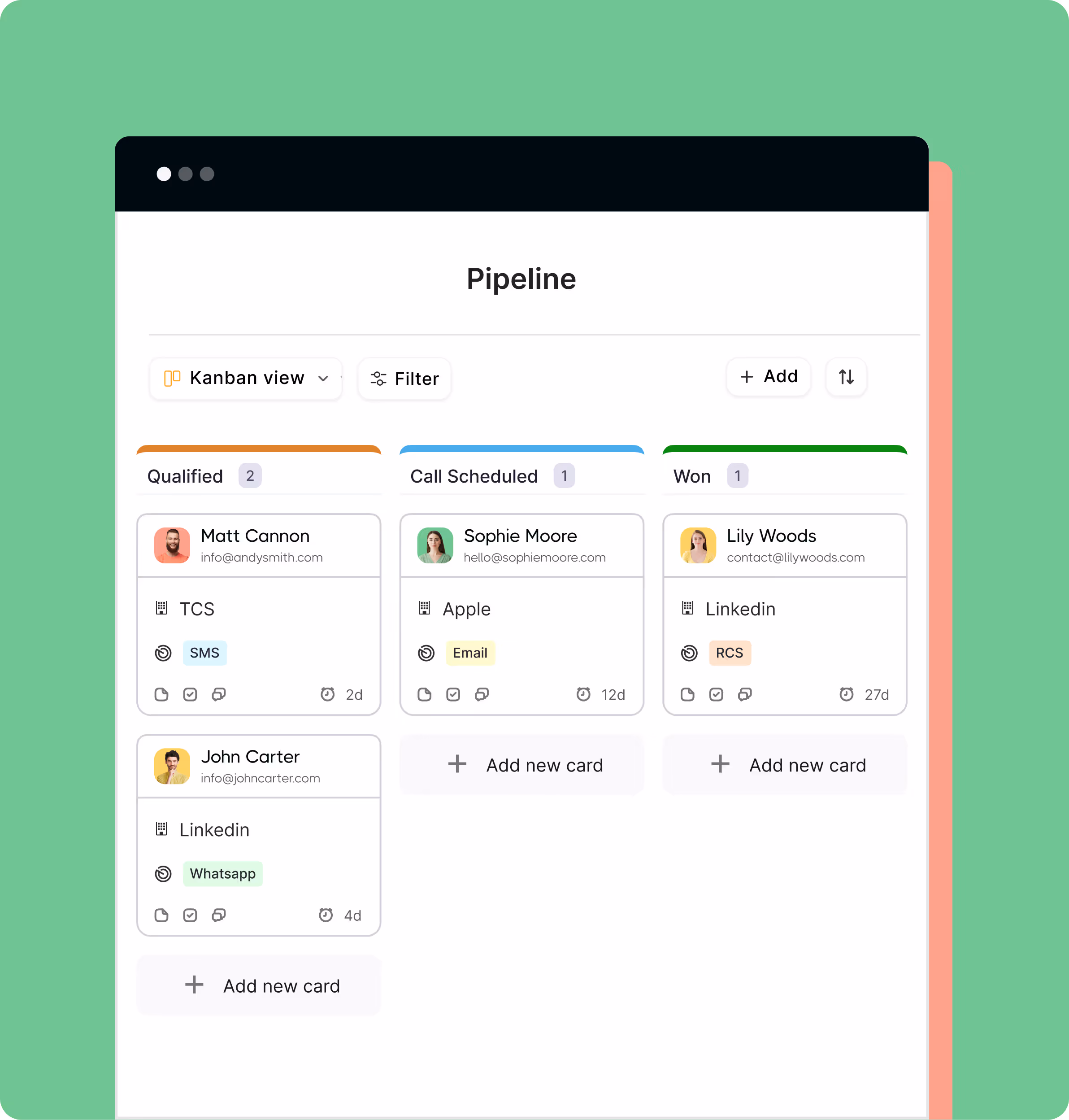 Manage contacts and automate conversations across Email, WhatsApp, SMS & more. Engage leads across multiple channels directly from your CRM. AI-driven automation schedules follow-ups and personalizes outreach.