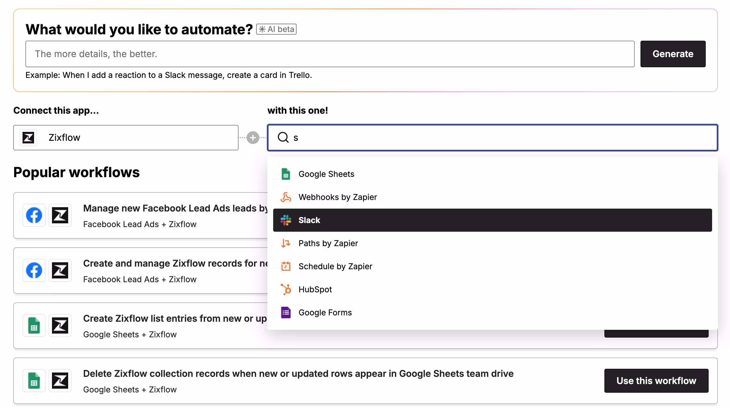 With Zapier, you can integrate Zixflow to more than 6,000+ apps such as Google Sheets, Slack, Gmail, Calendly, Typeform, HubSpot, and so much more. Build automated workflows—called Zaps—that trigger actions in Zixflow or another connected tool based upon conditions you set.
